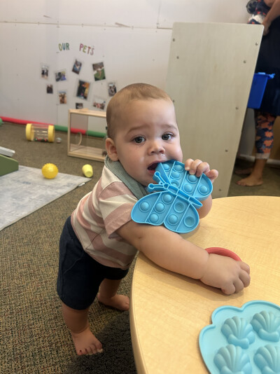 We have two classrooms for the infants; one is for our youngest infants and another is for our older infants who have adjusted to one nap and are on our schedule. During the first two years of life, children are working on acquiring a sense of trustworthiness in themselves and others. This is the sense of safety and security that comes from responsive and predictable care from familiar others to whom the child is attached. For older infants, a strong sense of autonomy is building. This comes from being treated as an individual and being allowed opportunities for independence.